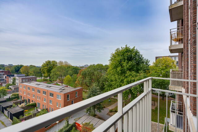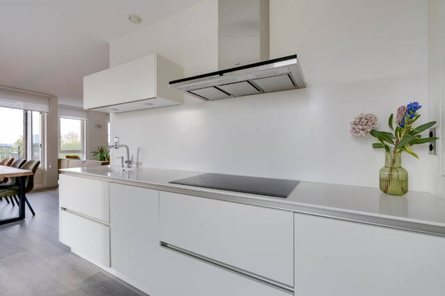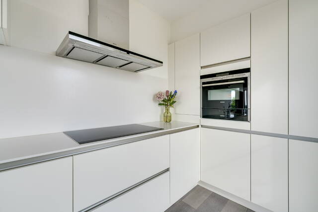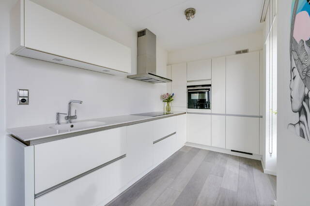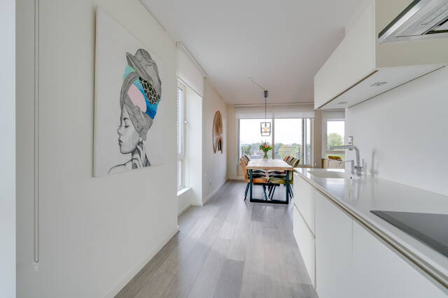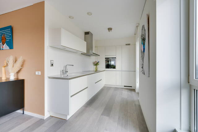 6th floor: entrance, spacious hallway providing access to all rooms, utility and heating meter cupboards, indoor storage room with mechanical ventilation and washing machine connection. The generous living room features floor-to-ceiling windows and direct access to the sunny south-facing balcony. The modern open kitchen (by Tuijp Keukens) is equipped with various built-in appliances from Siemens and AEG, including an induction hob, combination oven/microwave, dishwasher, fridge/freezer, and extractor hood.