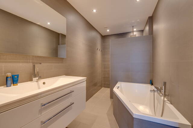The apartment has three bedrooms, including a large master bedroom with a walk-in closet. The luxurious bathroom with underfloor heating includes a bathtub, walk-in shower, and washbasin unit. There is also a separate toilet with a washbasin.