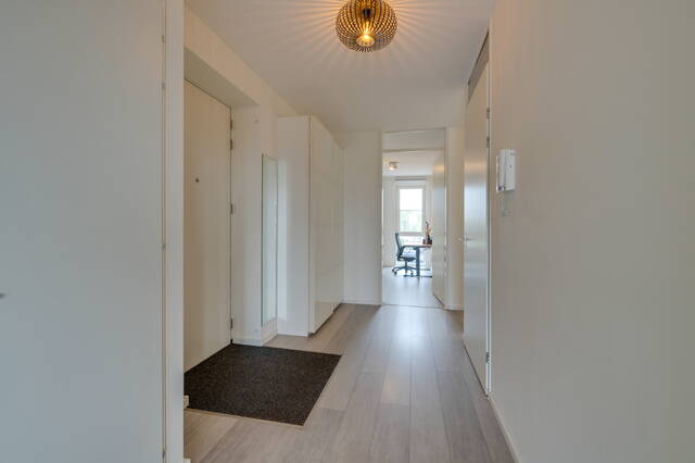 6e verdieping: entree, riante hal met toegang tot alle ruimtes, meterkast en stadsverwarmingskast, inpandige berging met mechanische ventilatie en aansluiting voor de wasmachine. De royale woonkamer heeft ramen tot op de vloer en directe toegang tot het zonnige balkon op het zuiden. De moderne open keuken (door Tuijp Keukens) is uitgerust met diverse inbouwapparatuur van Siemens en AEG, waaronder een inductiekookplaat, combi-oven/magnetron, vaatwasser, koel-/vriescombinatie en afzuigkap. Het appartement telt drie slaapkamers, waaronder een ruime hoofdslaapkamer met inloopkast. De luxe badkamer met vloerverwarming is voorzien van ligbad, inloopdouche en wastafelmeubel. Er is een separaat toilet met fontein.