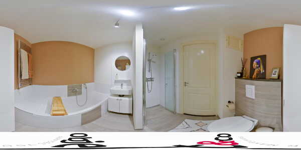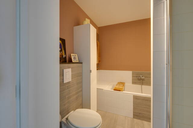 De luxe badkamer is modern uitgevoerd met een inloopdouche, ligbad, wastafelmeubel en hangend toilet. Daarnaast is er een separate ruimte met aansluitingen voor de wasmachine en droger, waar ook de Intergas HR Kompakt cv-ketel uit 2011 is geplaatst.