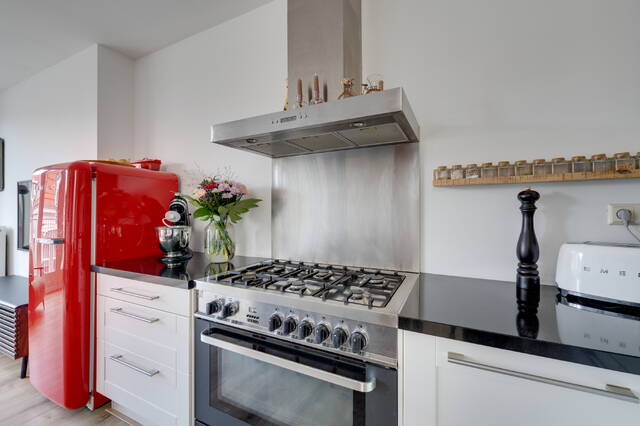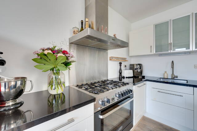 Via de gezamenlijke entree bereik je de derde verdieping, waar de hal toegang geeft tot alle vertrekken. De ruime en lichte woonkamer aan de voorzijde beschikt over een open keuken, voorzien van diverse inbouwapparatuur waaronder een groot La Germania gasfornuis met oven, afzuigkap, vaatwasser en rvs spoelbak. Vanuit de woonkamer geven dubbele openslaande deuren een mooie doorkijk vanaf het Frans balkon.