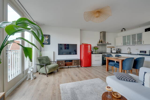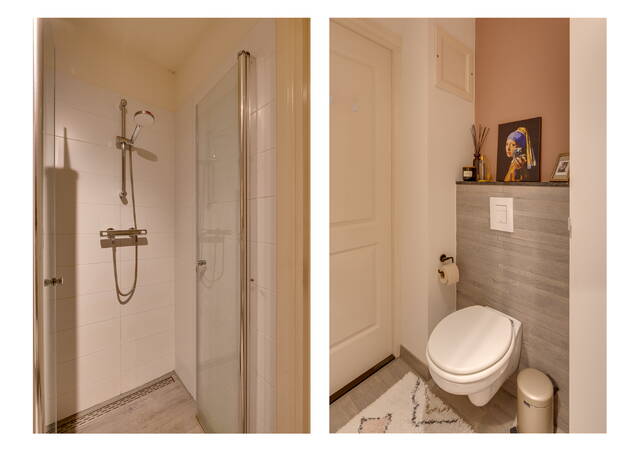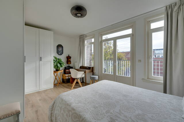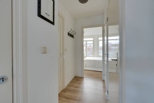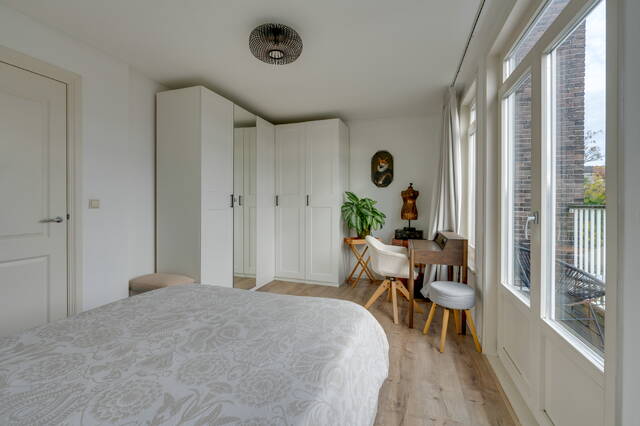 De slaapkamer bevindt zich aan de rustige achterzijde, waar ook de toegang is tot het zonnige balkon. Via een vaste trap in de hal bereik je het ruime en zonnige privé dakterras.