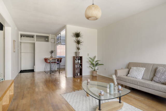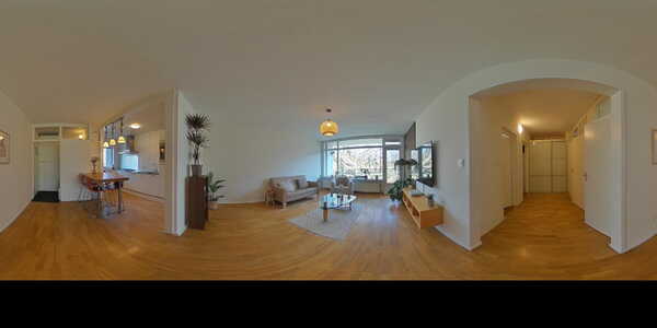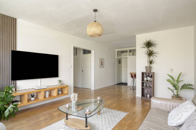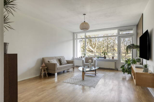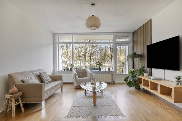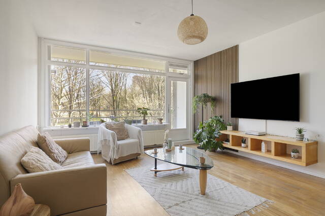 De ruime woonkamer is voorzien van een houten parketvloer, gestuukte wanden met wandpaneel, grote raampartijen en een deur met toegang tot het balkon op het oosten, waar je uitkijkt over het park en in de ochtend heerlijk van de zon kunt genieten.