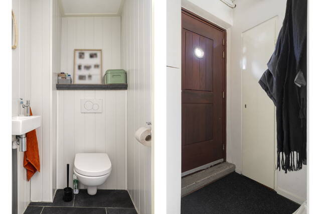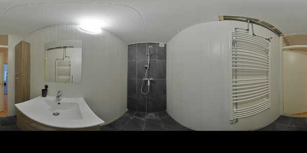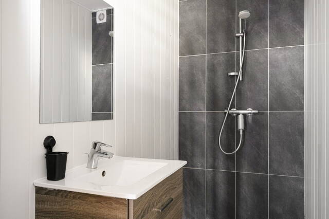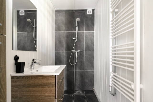 Vanuit de woonkamer bereik je de tussenhal die toegang geeft tot drie slaapkamers en de badkamer. De badkamer is ingericht met een douche, wastafelmeubel en een handdoekradiator.