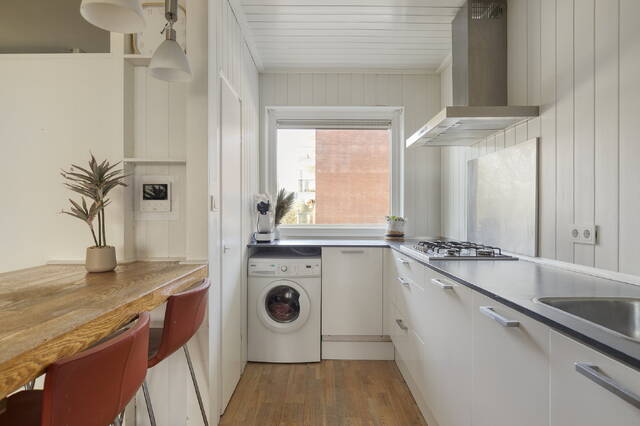 Eerste verdieping: zonnige galerij, entree/hal met meterkast, stadsverwarmingsunit en de separate toiletruimte v.v. zwevend toilet en fonteintje. Aan de voorzijde van de woning bevindt zich de half open verzorgde keuken in L-opstelling voorzien van een koel-vriescombinatie, oven, vaatwasser, gasfornuis en afzuigkap. Ook de aansluiting voor de wasmachine bevindt zich hier. Daarnaast is er een praktische inbouwkast aanwezig die dienst doet als provisiekast.