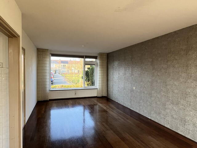 De doorzonwoonkamer kenmerkt zich door de grote raampartijen aan zowel de voor- als achterzijde, waardoor er gedurende de gehele dag sprake is van een aangename lichtinval. De ruimte is afgewerkt met een houten vloer.