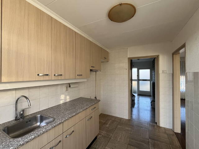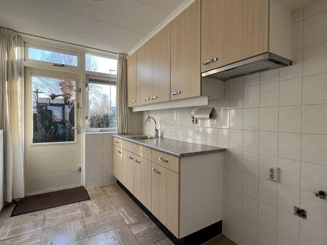 De keuken is uitgevoerd met een eenvoudig keukenblok en beschikt over een afzuigkap, gasaansluiting en de wasmachineaansluiting. Vanuit de keuken is eveneens de woonkamer bereikbaar.