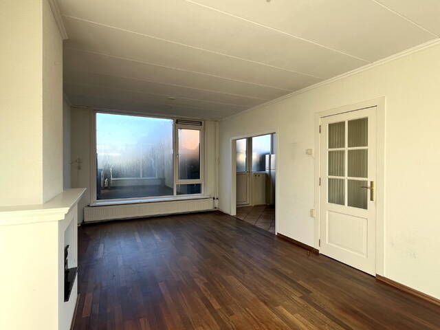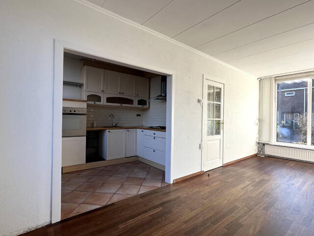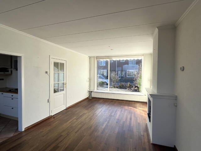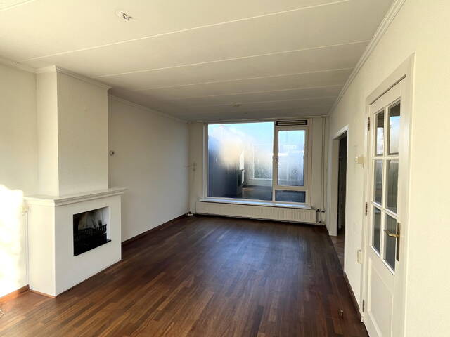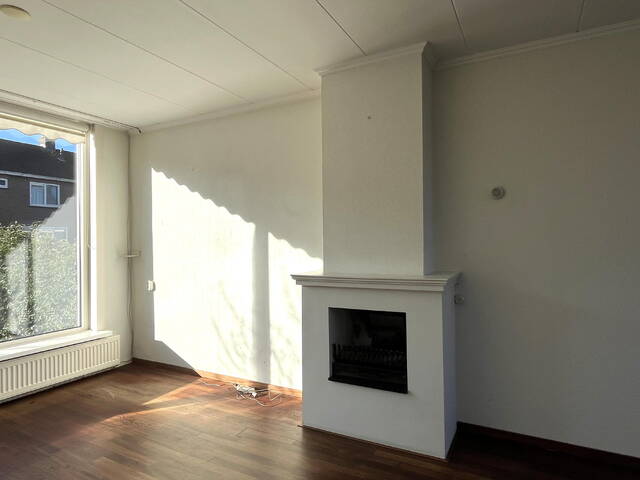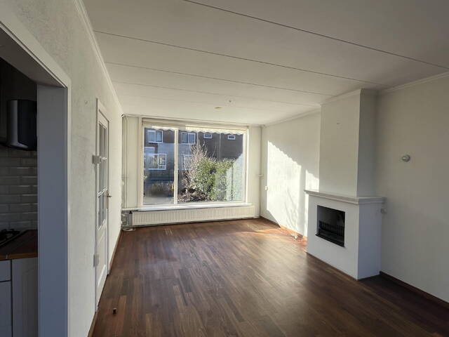 De doorzonwoonkamer is heerlijk licht dankzij de grote raampartijen aan zowel de voor- als achterzijde. De ruimte is voorzien van een schouw met open haard en een parketvloer, wat bijdraagt aan een sfeervolle uitstraling.