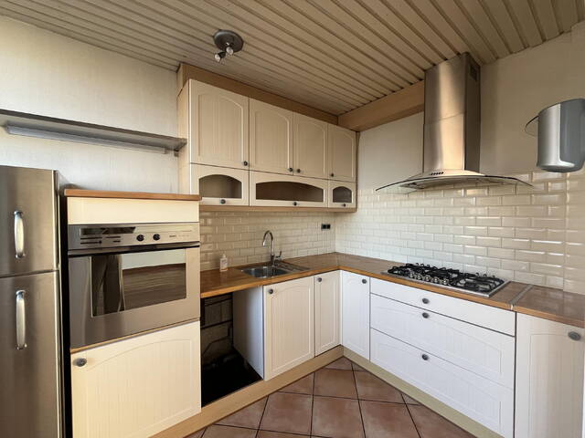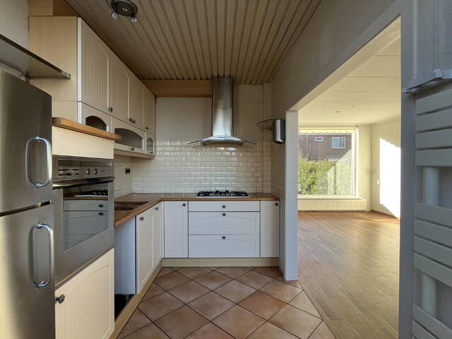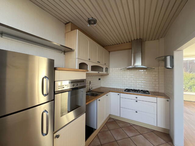 De open keuken bevindt zich aan de achterzijde van de woning en is uitgerust met een vijfpits gaskookplaat, afzuigkap, ingebouwde oven en een losse koel-/vriescombinatie. Vanuit de keuken heeft u direct toegang tot de achtertuin.