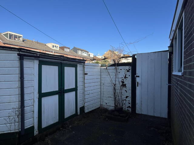 •Achtertuin met stenen berging (met keukenunit), houten berging en achterom