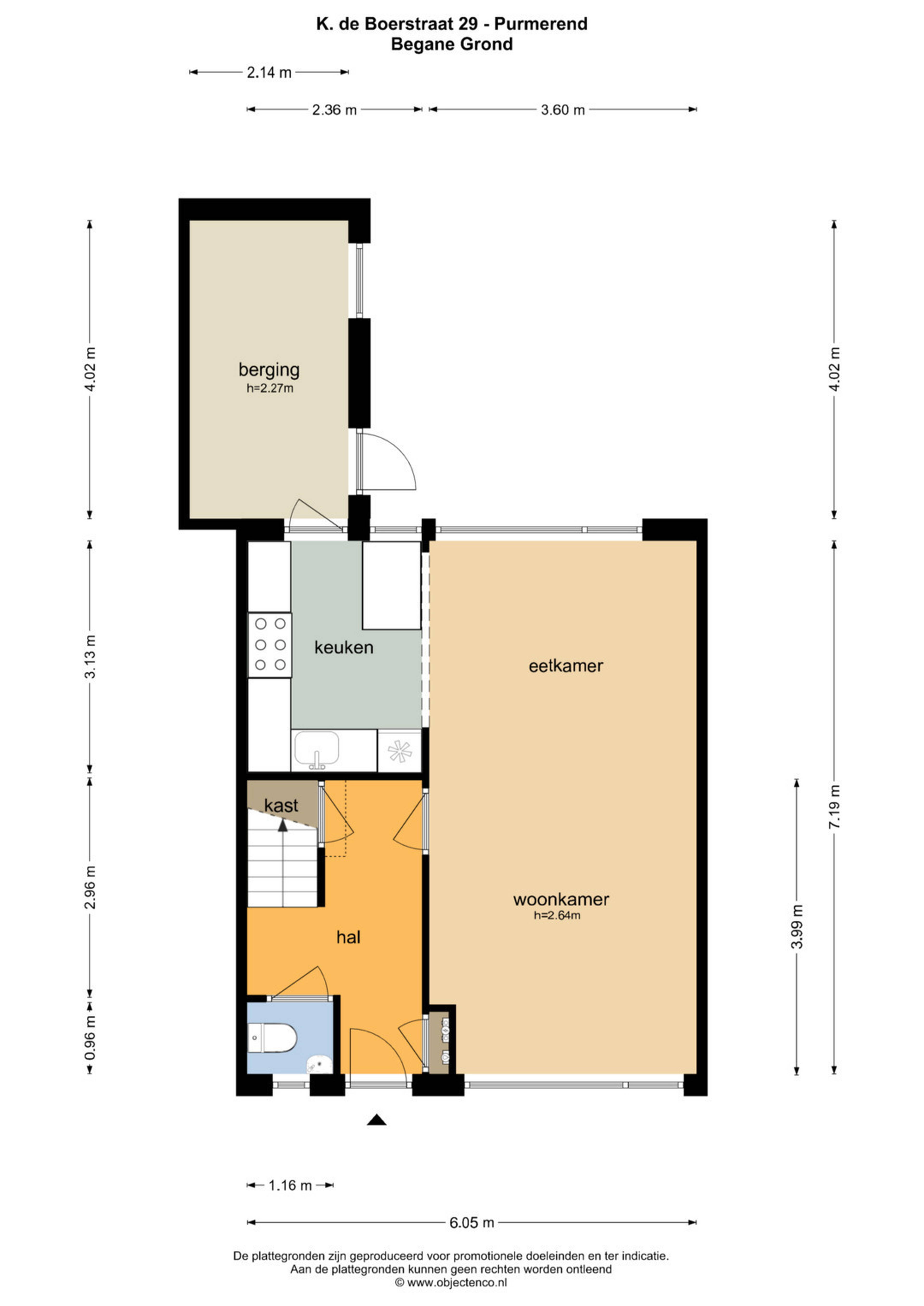 Bij binnenkomst treft u de hal met garderobe, waar ook het eerste toilet op de begane grond zich bevindt met gangkast. Bij de deur rechts komt u binnen in de woonkamer met veel lichtinval en v.v. een laminaatvloer, open keuken in hoekopstelling v.v. inbouwapparatuur en een eiland met opbergmogelijkheden. Via de keuken komt u in de bijkeuken v.v. elektra, kraan en wasmachine-aansluiting, waar extra opslag mogelijk is en de deur naar de achtertuin van maar liefst ca. 14m¹ diepte en ca. 70m². In de achtertuin bevindt zich een kleine schuur voor het wegzetten van fietsen of de barbecue.