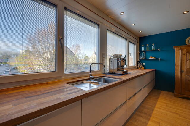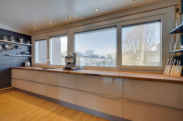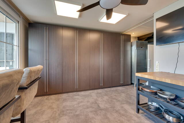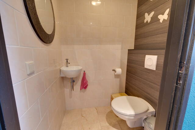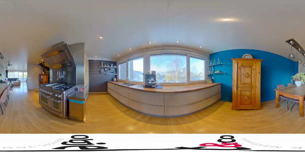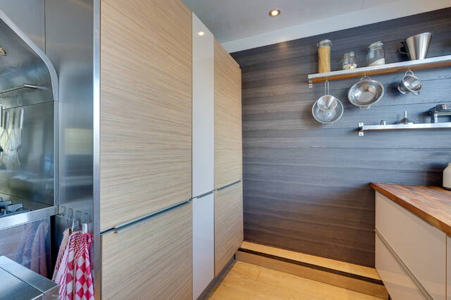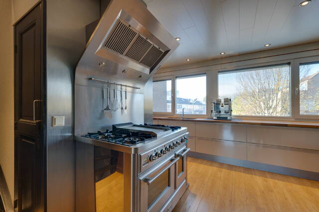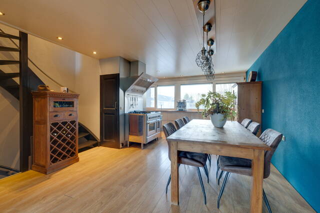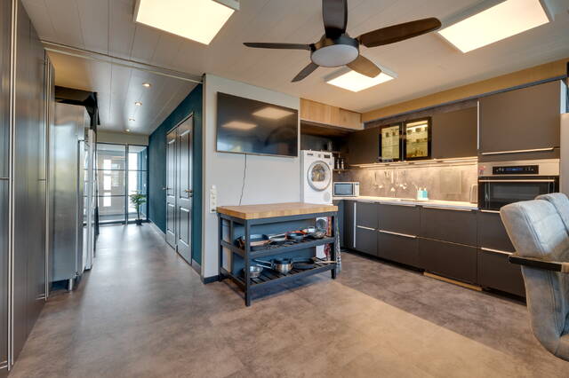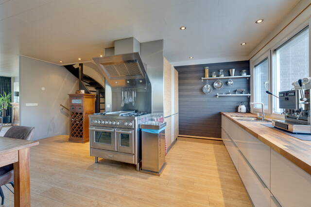 Verder vind je op deze verdieping het toilet en de woonkeuken bevindt zich aan de achterzijde, deze is voorzien van een Amerikaanse koelkast, vaatwasser en combi-oven. Hier bevindt zich ook de wasmachineaansluiting.