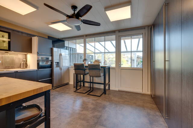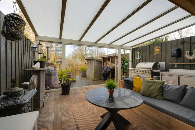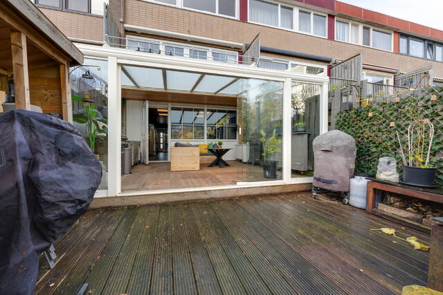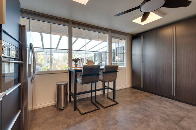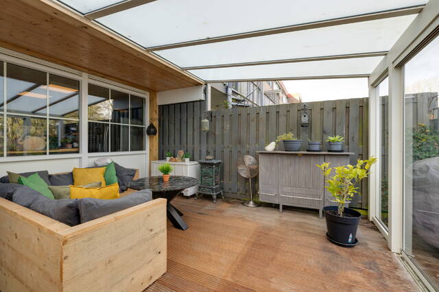 Achter de woonkeuken ligt de ruime serre van ca. 5 × 4,6 meter, onderheid met vier schroefpalen. In combinatie met de tuin op het zuidoosten vormt dit een ideale plek voor lange avonden buiten en zomers leven beneden.