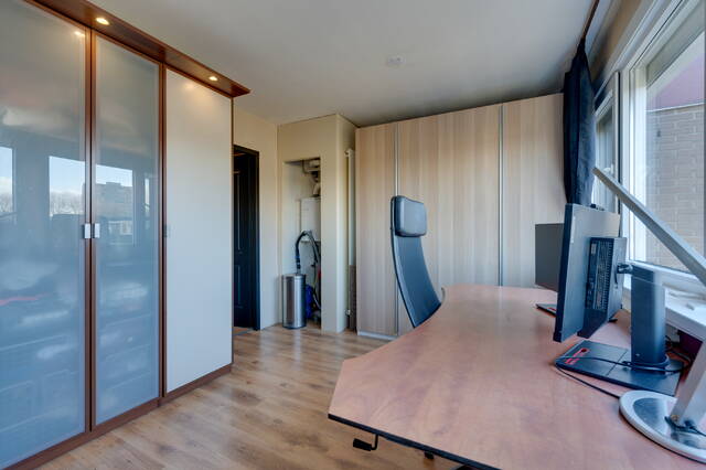 Entree met meterkast en open trap. Aan de voorzijde bevindt zich een praktische kamer, ideaal als werkruimte, opslag of hobbykamer. Hier staat tevens de waterontkalker.