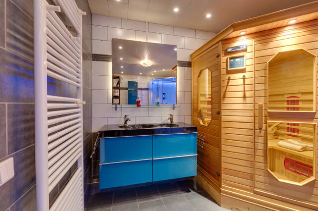 Overloop met toegang tot twee slaapkamers: één aan de voorzijde en één aan de achterzijde. Daarnaast bevindt zich de zeer ruime badkamer. Deze badkamer is uitgerust met een dubbele wastafel, sauna en stoomdouche. Een fijne, ontspannen plek na een drukke dag.
