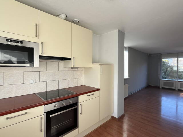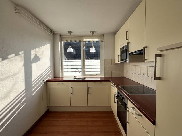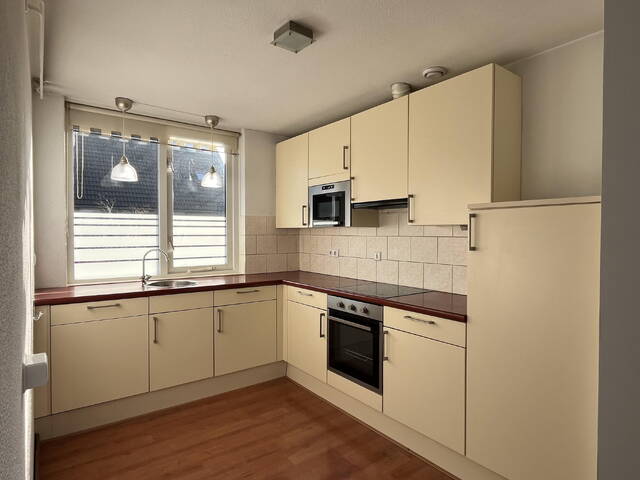 De open keuken is opgesteld in een hoek en is uitgerust met diverse inbouwapparatuur, waaronder een vaatwasser, oven, magnetron, keramische kookplaat, afzuigkap en koelkast.