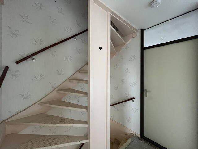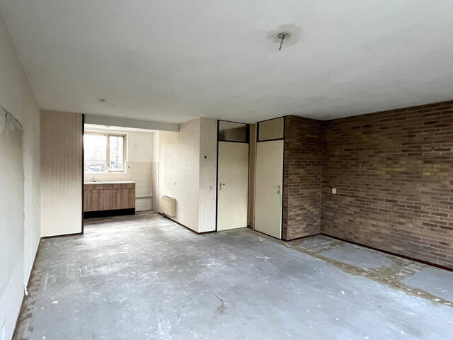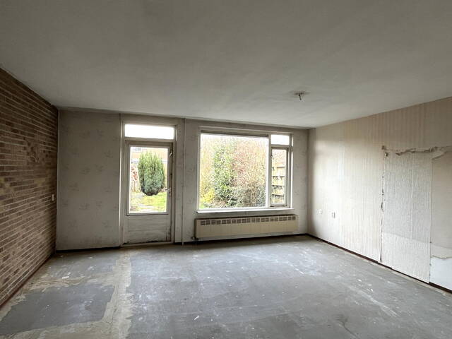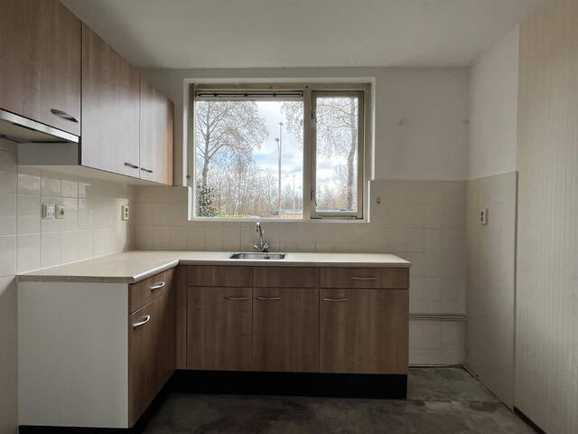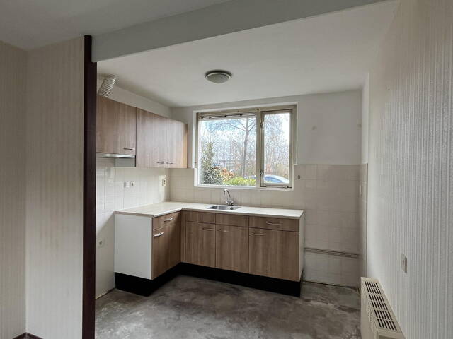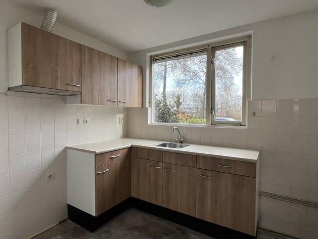 De woonkamer met open keuken is tuingericht en geniet van prettig daglicht. Aan de voorzijde van de woning bevindt zich de eenvoudige keukenopstelling met uitzicht op de straat. In de woonkamer is een praktische trapkast aanwezig voor extra bergruimte. Via de achterdeur heeft u toegang tot de achtertuin.