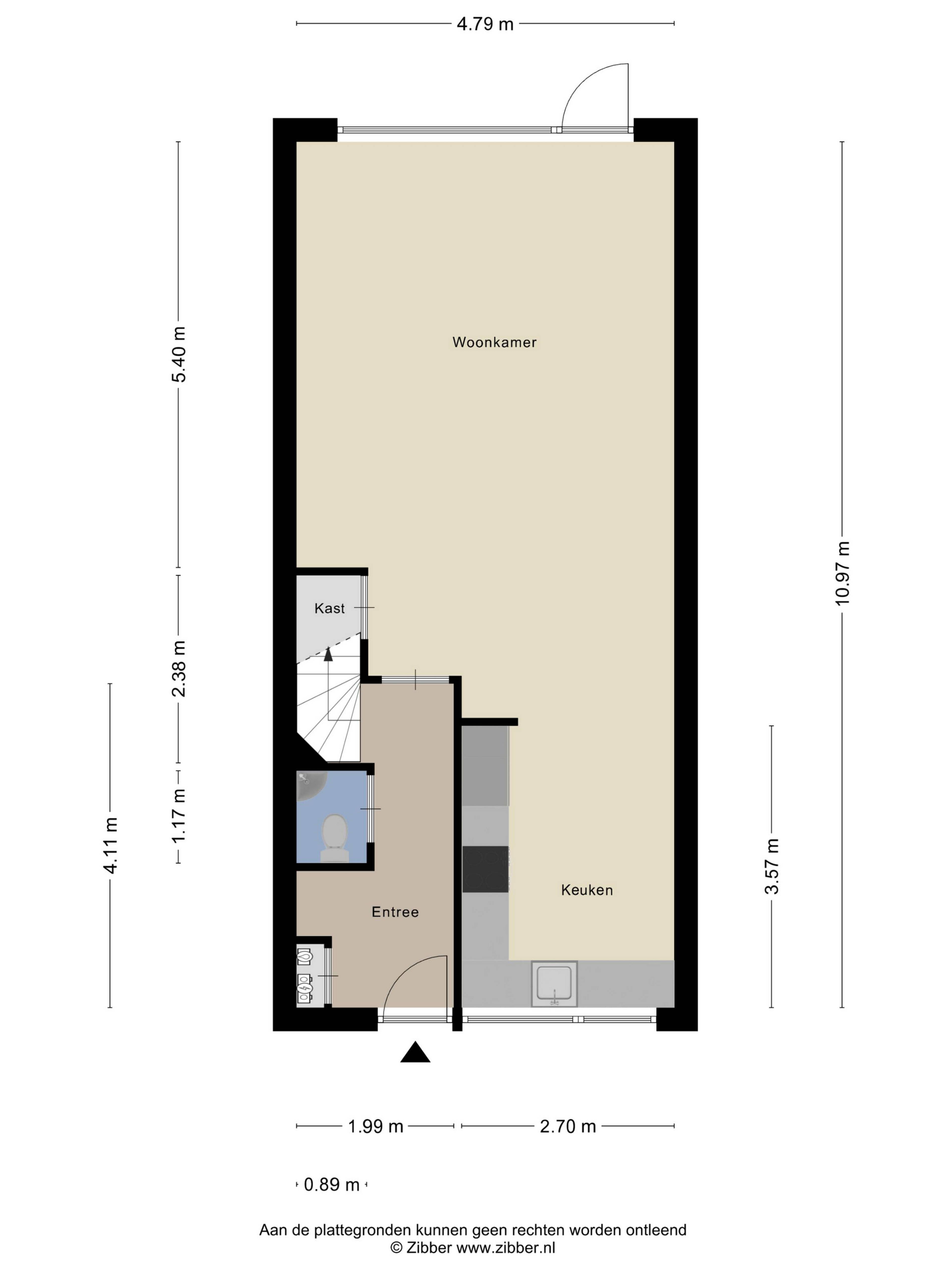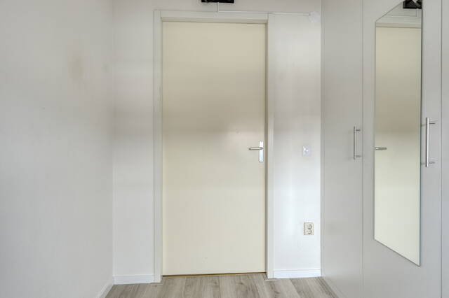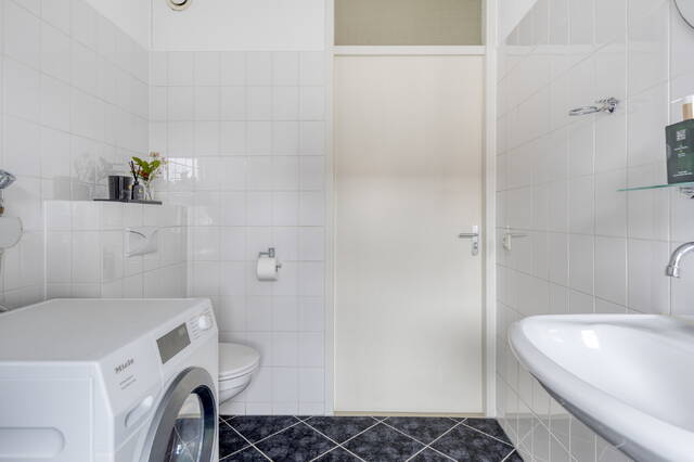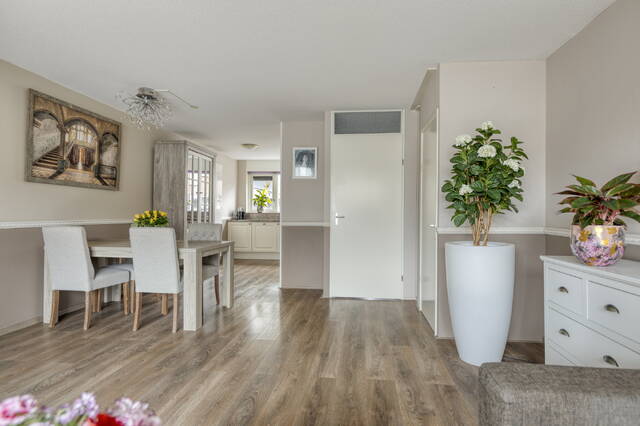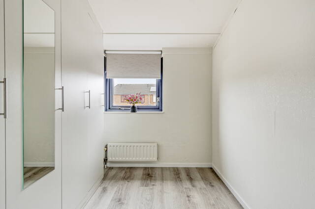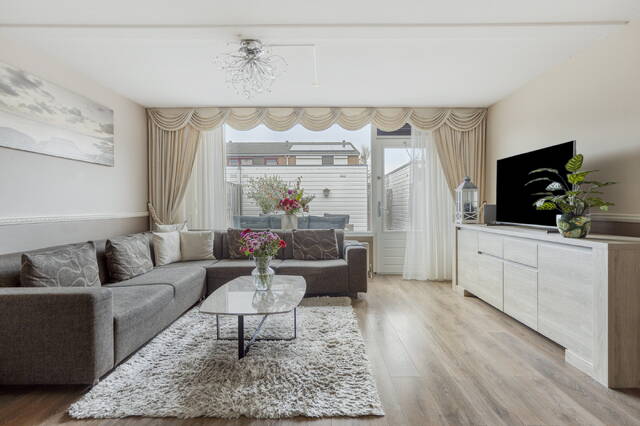 Via de voortuin bereik je de entree met hal, met meterkast, kast voor de stadsverwarmingsunit en een toilet met fonteintje. Vanuit de hal heb je toegang tot de uitgebouwde woonkamer. De woonkamer is voorzien van een laminaatvloer en biedt dankzij de uitbouw extra leefruimte. De trapkast fungeert als praktische bergruimte.