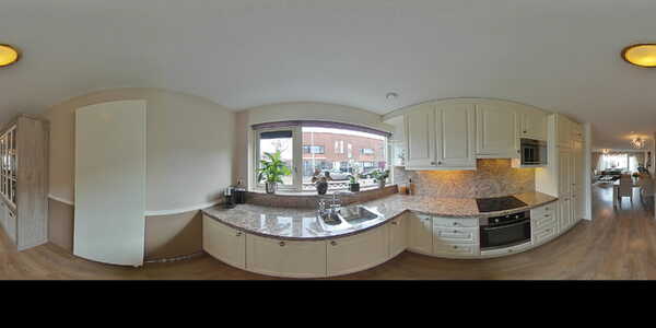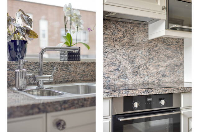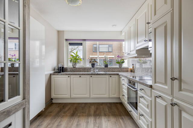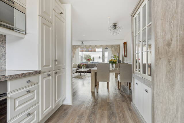 De open keuken is geplaatst in een hoekopstelling en uitgevoerd met een natuurstenen werkblad. De keuken beschikt over een keramische kookplaat, afzuigkap, oven, magnetron, vaatwasser en een koel-vriescombinatie.