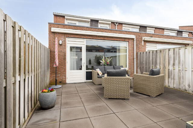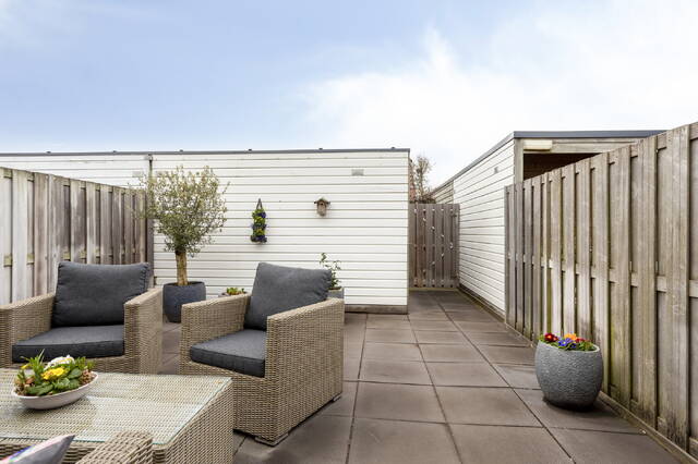 De achtertuin van circa 8 bij 5 meter is gelegen op het westnoordwesten, waardoor je hier in de middag en avond van de zon kunt genieten, ideaal voor na het werk. De tuin is volledig betegeld en voorzien van een vrijstaande houten berging en een achterom. Aan de achtergevel bevindt zich een elektrisch bedienbaar zonnescherm.