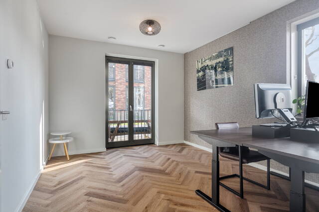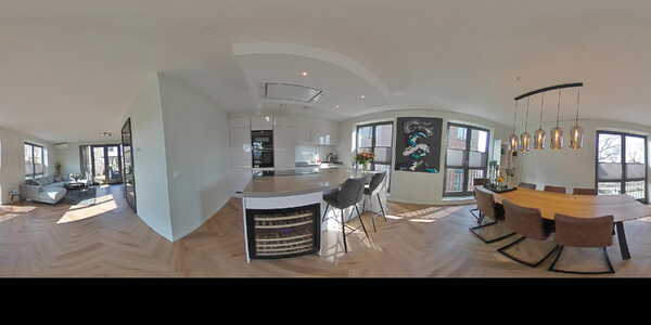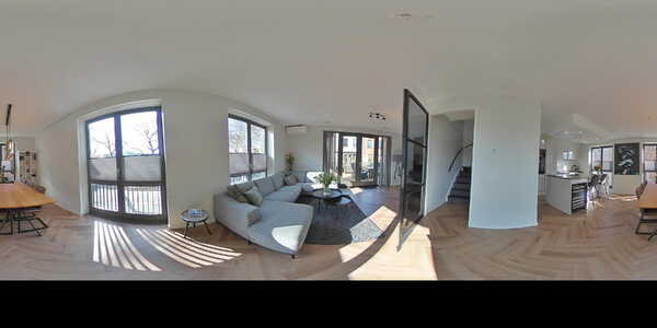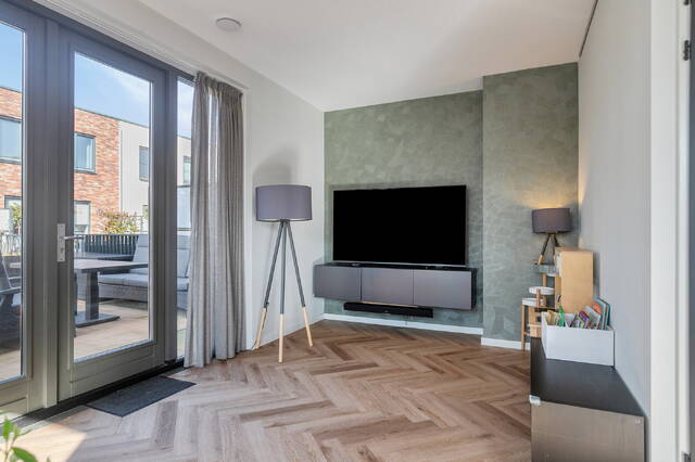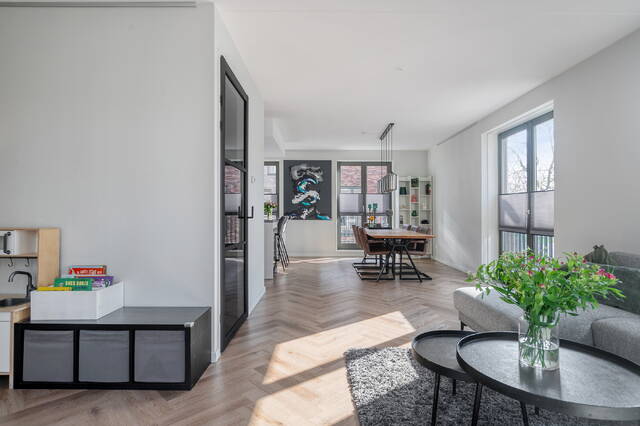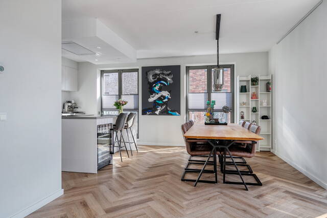 De woonverdieping is een echte eyecatcher. De lichte woonkamer met luxe open keuken is afgewerkt met een pvc visgraatvloer die zorgt voor een warme en stijlvolle uitstraling. Door de hoekligging en de vele raampartijen is de lichtinval hier bijzonder aangena Hier geniet je volop van de middag- en avondzon en heb je meer dan genoeg ruimte voor een loungeset en eettafel.
