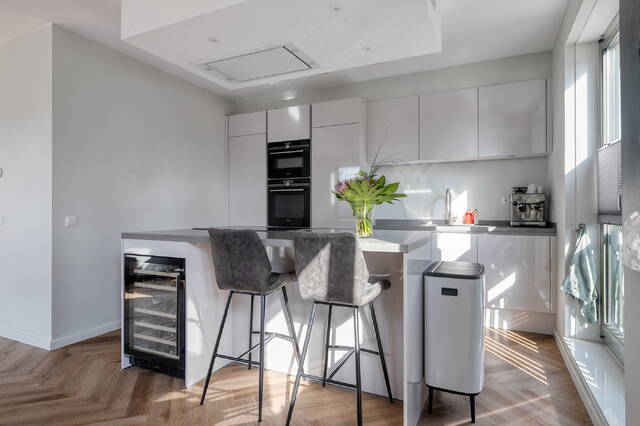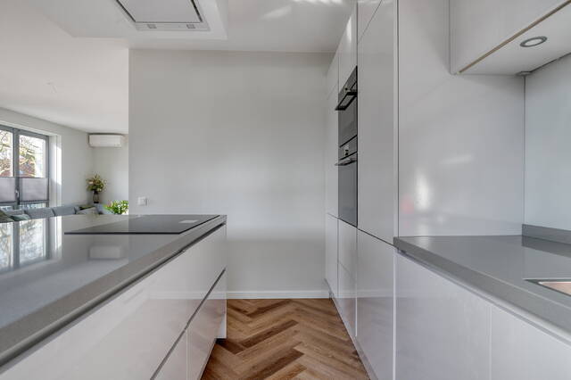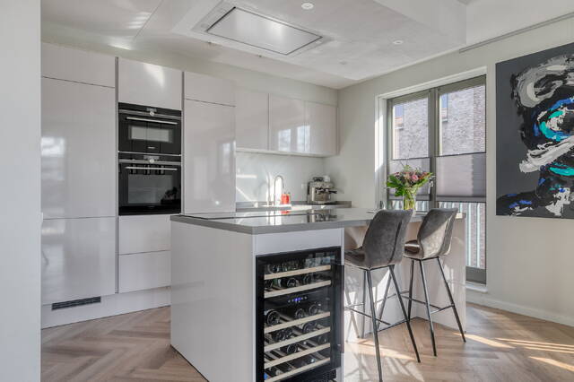 De keuken is hoogwaardig uitgevoerd en voorzien van een wijnklimaatkast, zonevrije inductiekookplaat, stoomoven, combi oven, koelkast, vaatwasser, afzuigkap en een Quooker. Een keuken die niet alleen praktisch is, maar ook uitnodigt tot uitgebreid koken en gezellig samenzijn.