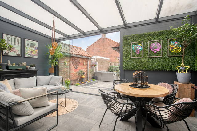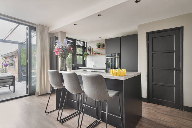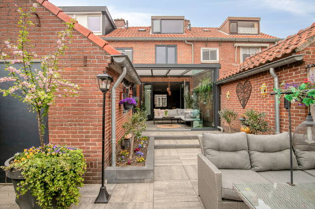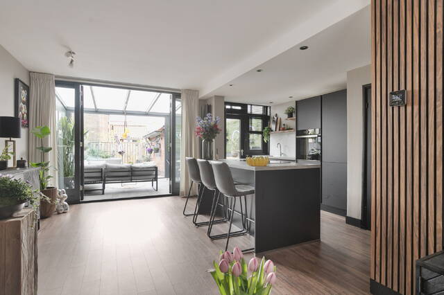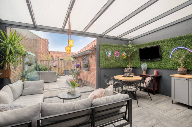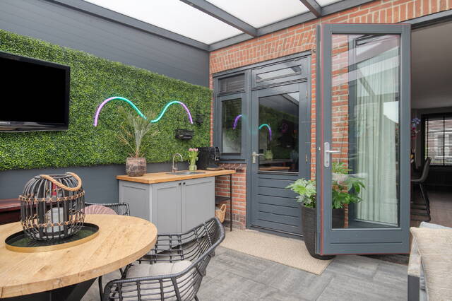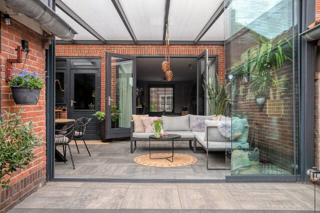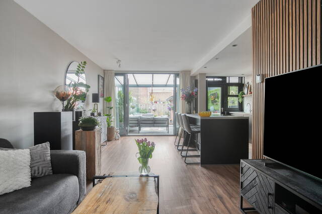 De serre aan de achterzijde vormt een prachtige extra leefruimte en sluit naadloos aan op de woonkamer, waardoor een royale en lichte leefomgeving ontstaat met uitzicht op de ruime en zonnige achtertuin.