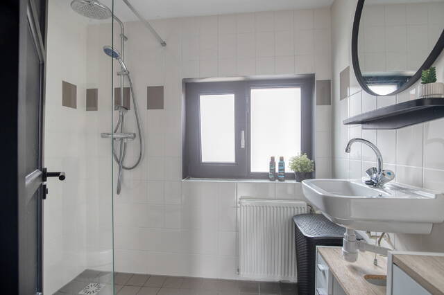 Eerste verdieping: overloop met toegang tot drie kamers, waarvan één momenteel in gebruik is als wasruimte. De slaapkamers beschikken over 1 of meerdere inbouwkasten. De badkamer is compleet uitgevoerd met douche, toilet en wastafel.