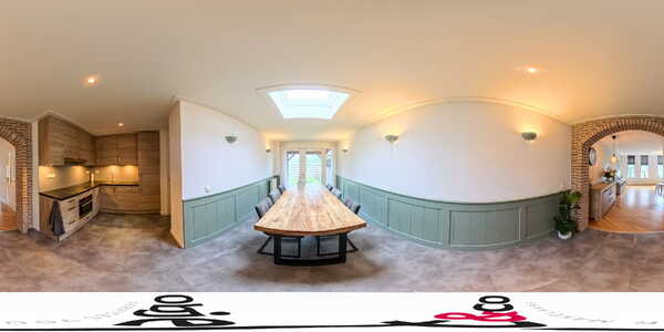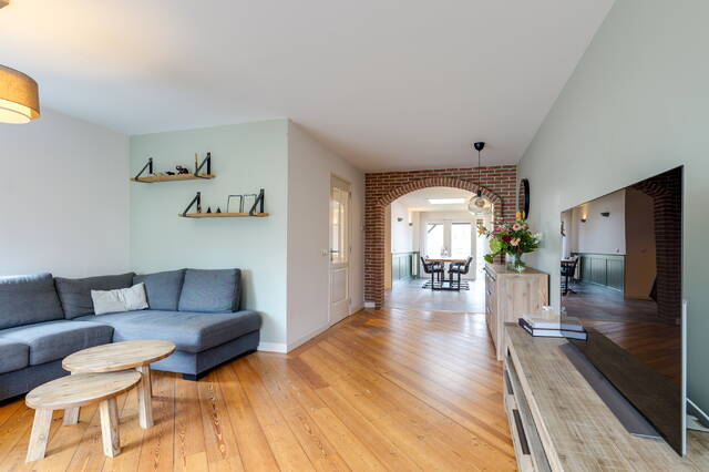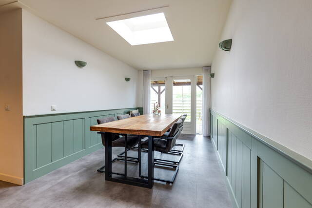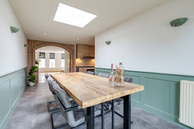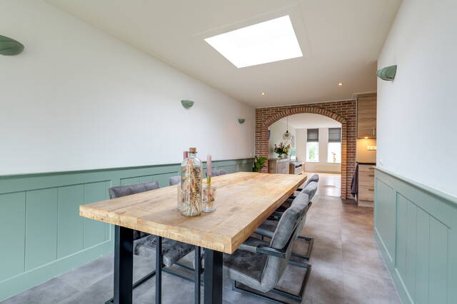In de aanbouw bevindt zich de eethoek met dubbele openslaande deuren naar de tuin en een daklicht dat zorgt voor extra daglichttoetreding. Hier is genoeg ruimte voor een grote eettafel voor het hele gezin.