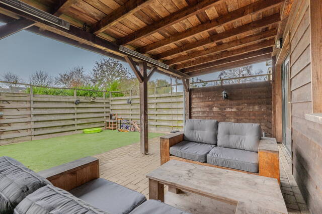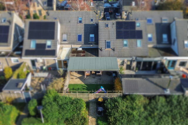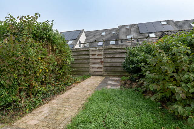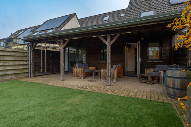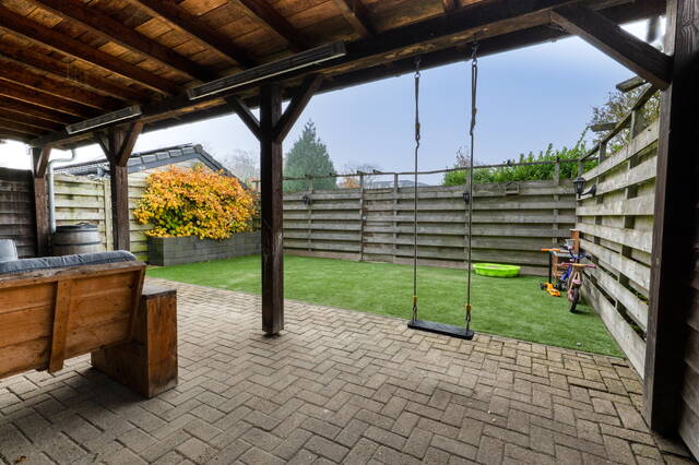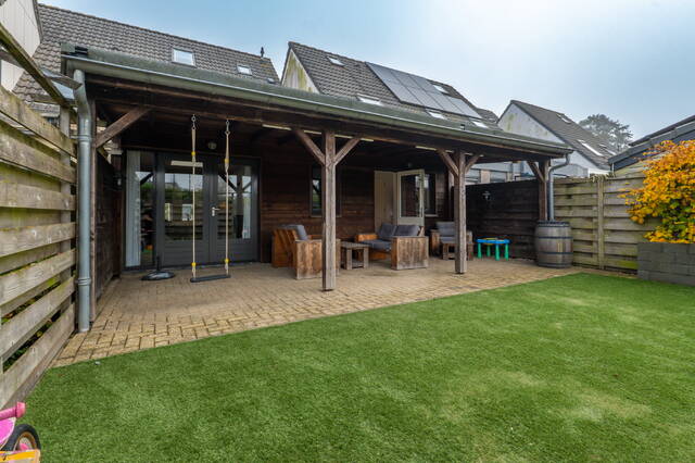 De achtertuin is verzorgd aangelegd en voorzien van een fraaie overkapping, waar u heerlijk beschut kunt zitten, ongeacht het weer. Verder is de tuin ingericht met een onderhoudsarme kunstgrasmat en is er een achterom aanwezig. U kunt hier genieten van de zon tot in de avond en u heeft geen directe achterburen.