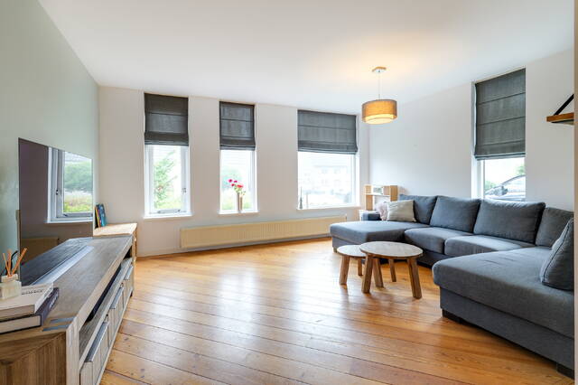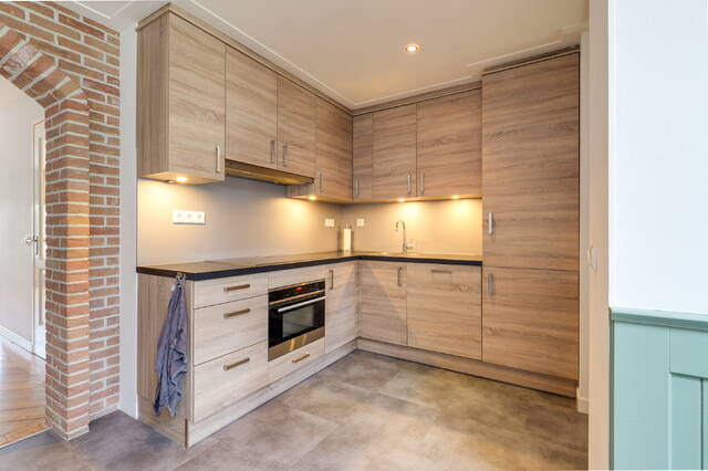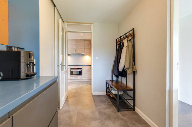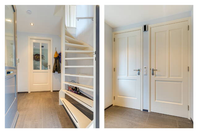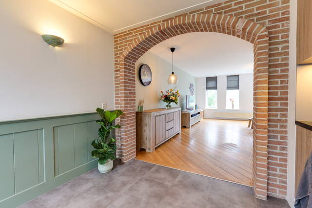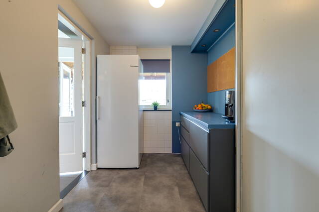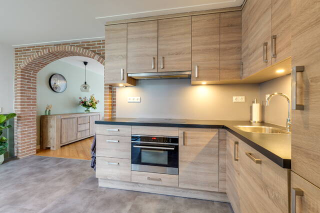 De overdekte entree bevindt zich aan de zijkant van de woning en geeft toegang tot de hal met meterkast en trapopgang naar de eerste verdieping. De woonkamer is aangenaam licht dankzij ramen aan zowel de voor- als zijkant van de woning en is afgewerkt met een fraaie houten vloer. De open keuken is voorzien van diverse inbouwapparatuur, waaronder een inductiekookplaat, koelkast, vriezer, vaatwasser en afzuigkap.