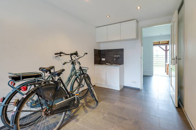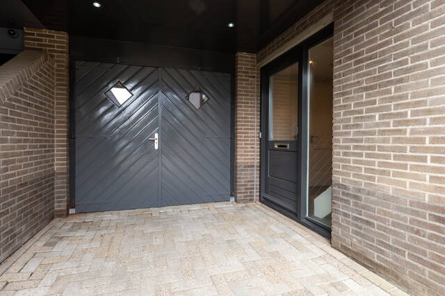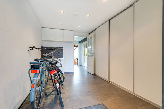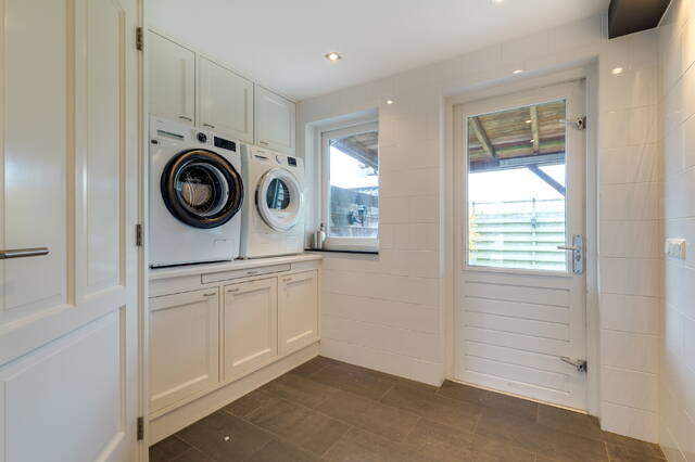 De woning beschikt over een eigen oprit met ruimte voor twee auto’s en een garage met dubbele openslaande deuren, inbouwverlichting, gootsteen en praktische inbouwkasten. Achter de garage bevindt zich een bijkeuken met toilet (voorzien van fonteintje) en aansluitingen voor de wasmachine en droger. Vanuit deze ruimte is er directe toegang tot de achtertuin. Daarnaast is er een tweede bijkeuken die grenst aan de keuken; deze ruimte kan ook uitstekend dienen als kantoor of thuiswerkplek en biedt tevens ruimte voor de garderobe.