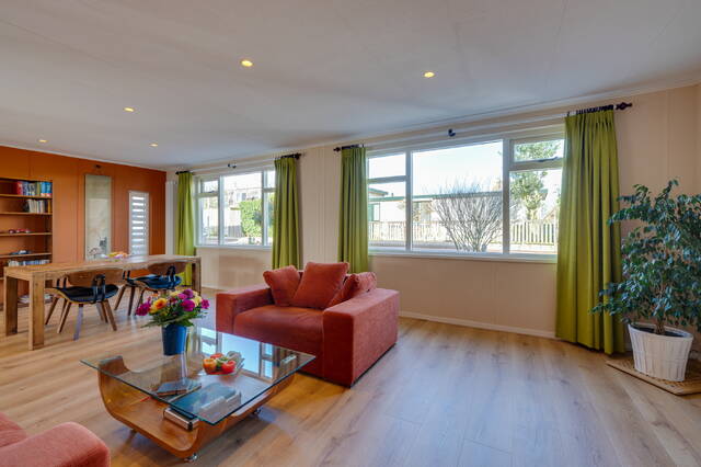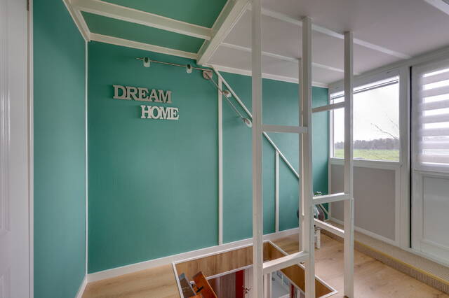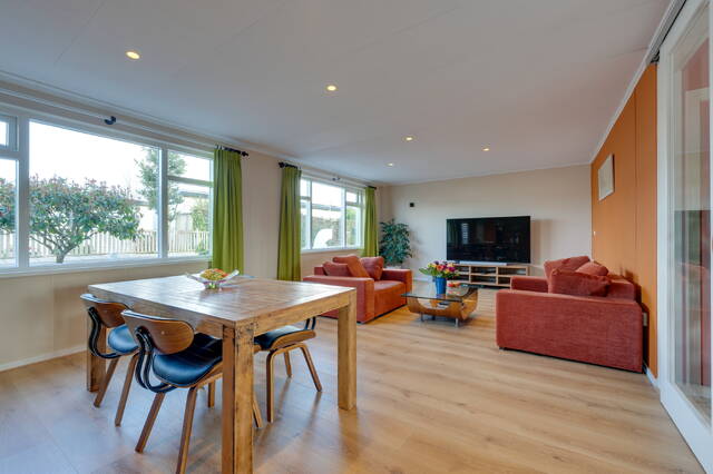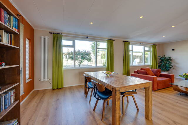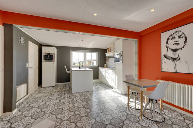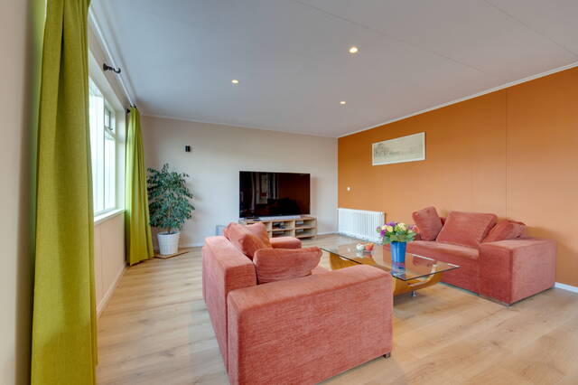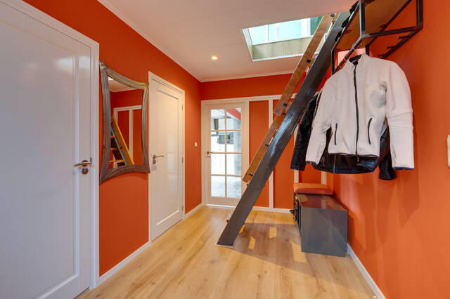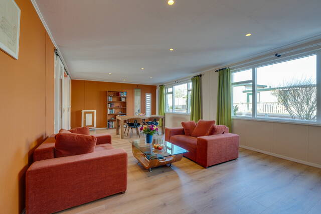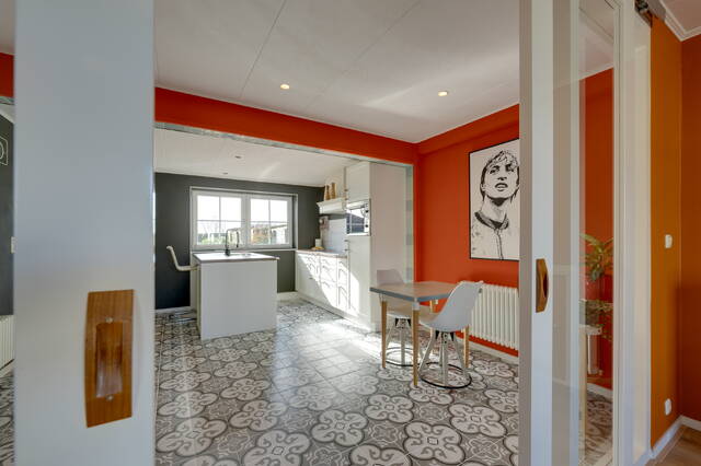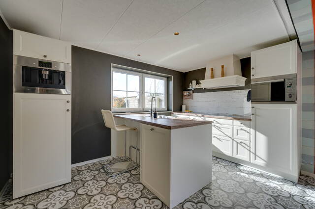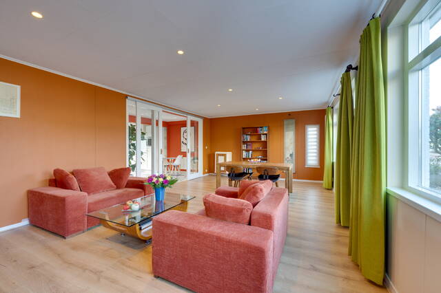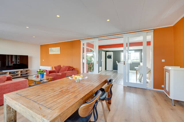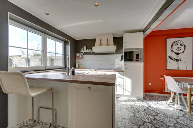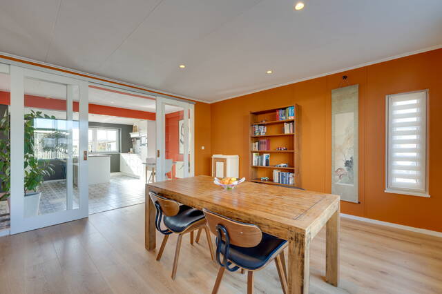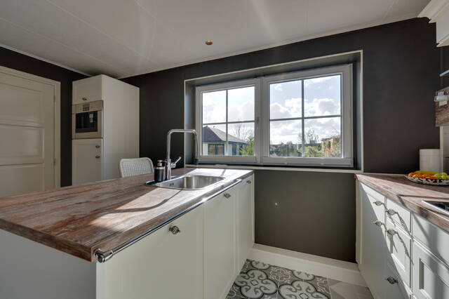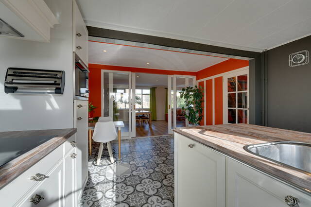 De royale woonkeuken is een centrale en veelzijdige leefruimte en is voorzien van een modern spoeleiland, een inductiekookplaat met afzuigkap, een ingebouwde combimagnetron-oven, koelkast, separate vriezer en zelfs een ingebouwd koffiezetapparaat. Voor de warmwatervoorziening is een elektrische boiler aanwezig. Vanuit de keuken bereikt u via stijlvolle en suite deuren de sfeervolle woonkamer, die is afgewerkt met een laminaatvloer van goede kwaliteit. De helft van deze ruimte deed in het verleden dienst als slaapkamer op de begane grond, wat de flexibiliteit van de woning onderstreept. Het is allemaal eenvoudig weer te realiseren.