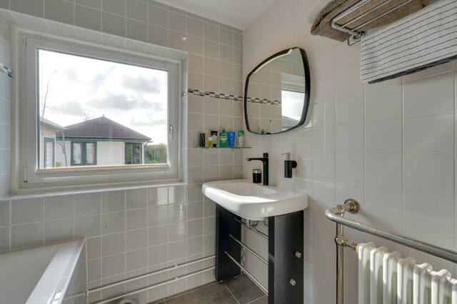 Bij aankomst valt direct de prettige situering op, met parkeergelegenheid op eigen oprit. De entree bevindt zich aan de zijkant van de woning en geeft toegang tot een ruime hal met trapopgang naar de eerste verdieping. Op de begane grond treft u een complete badkamer, voorzien van ligbad, douchecabine en wastafel, alsmede een separaat toilet met fonteintje.