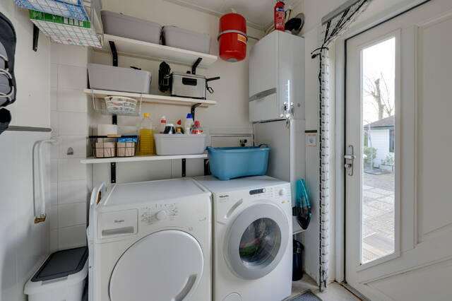 Aansluitend bevindt zich de praktinaarche bijkeuken met wasmachineaansluiting, opstelplaats voor de cv-ketel (Vaillant, bouwjaar 2012) en een deur naar de tuin.