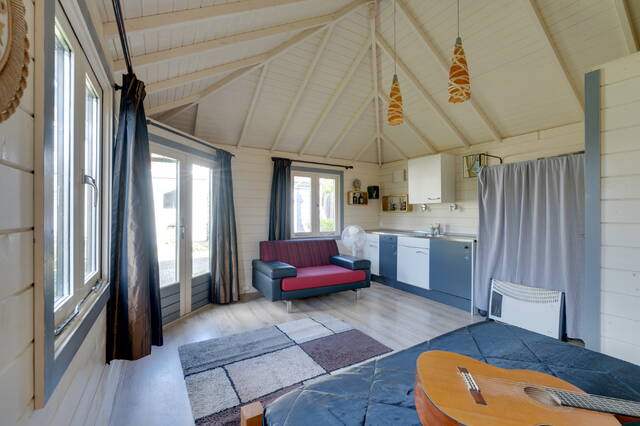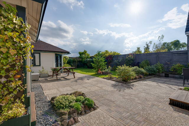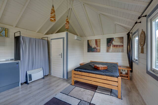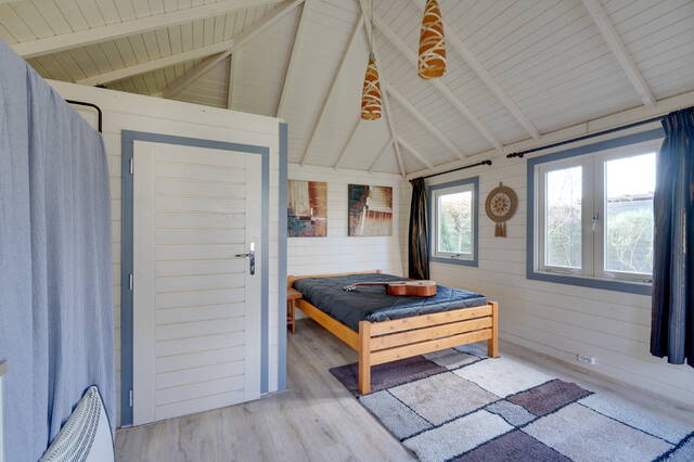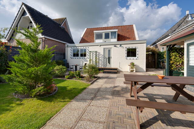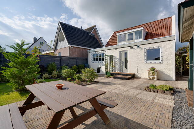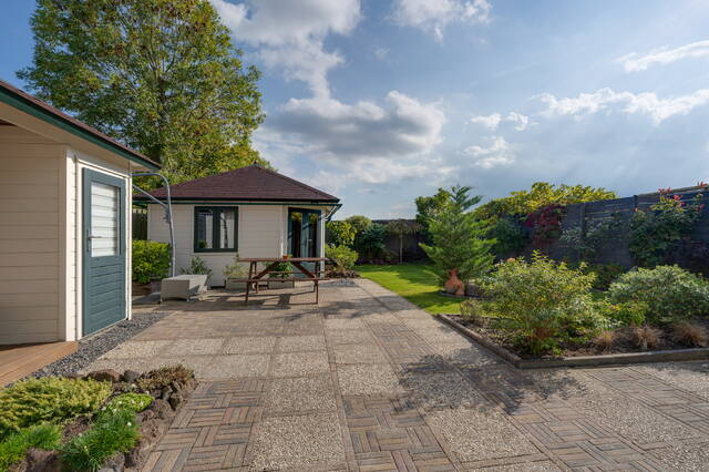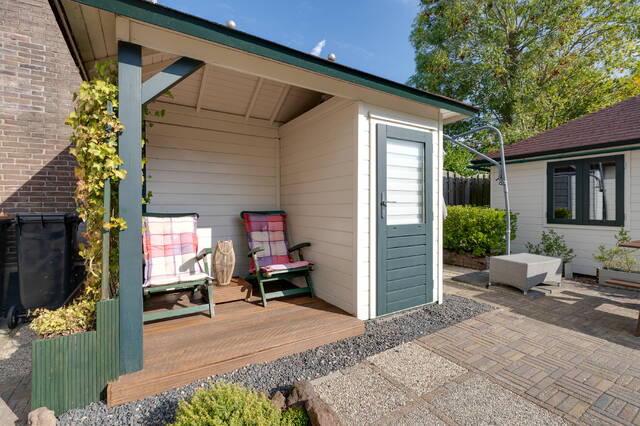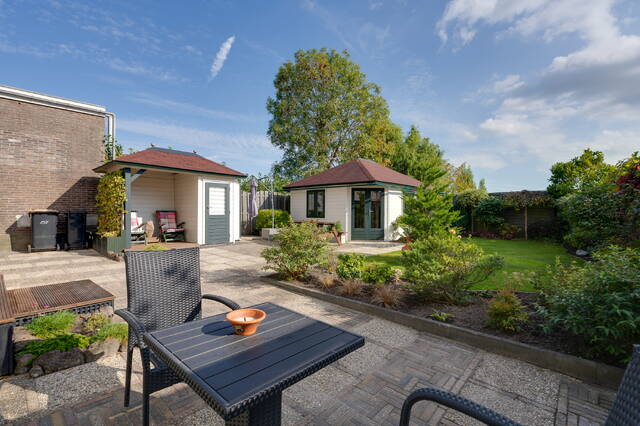 De achtertuin is een absoluut pluspunt: gelegen op het zuiden en met een weids uitzicht biedt deze een heerlijke plek om te ontspannen en te genieten van de zon. De tuin beschikt over een berging met compacte veranda en een vrijstaande blokhut. Deze blokhut is bijzonder compleet ingericht met woon-/slaapkamer, een eigen badkamer (douche, toilet en wastafel), een keukenblok met ingebouwde koelkast en een elektrische boiler van 30 liter. Dit maakt het bijgebouw uitermate geschikt als mantelzorgwoning, gastenverblijf of voor een thuiswonend (jong) volwassen kind.