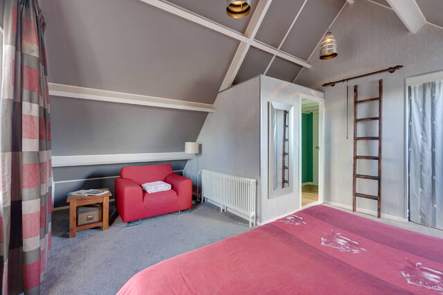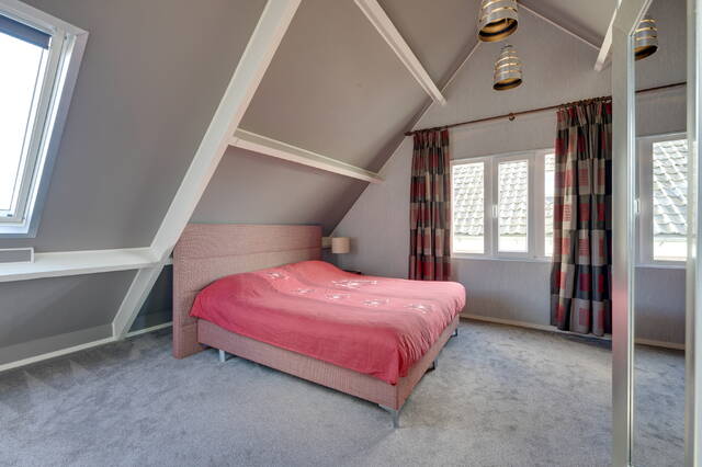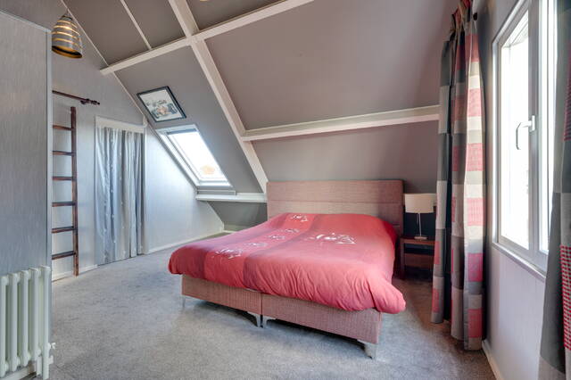 De eerste verdieping is bereikbaar via een karakteristieke molenaarstrap. Hier treft u een overloop met tweede sanitaire ruimte met Sanibroyeur toilet en wastafel met meubel alsmede twee royale slaapkamers. De hoofdslaapkamer beschikt over een separate kastruimte en biedt daarnaast toegang tot een praktische kleine vliering.